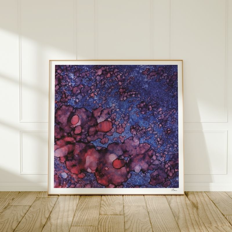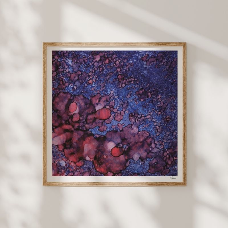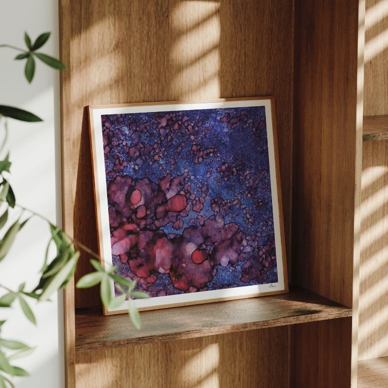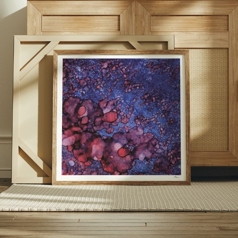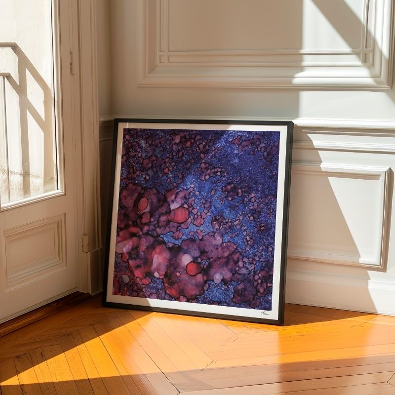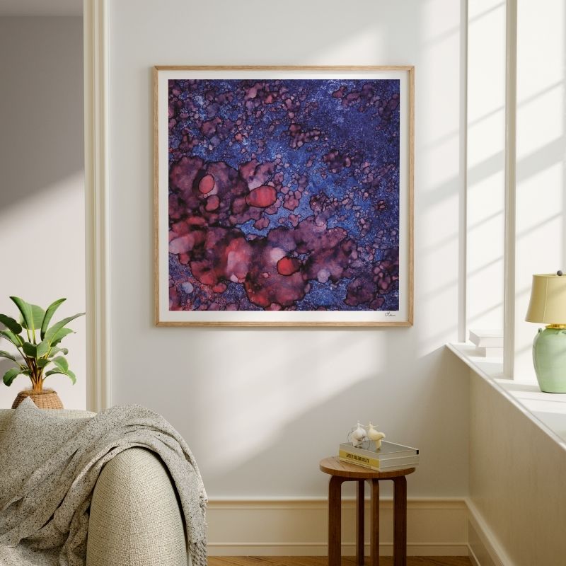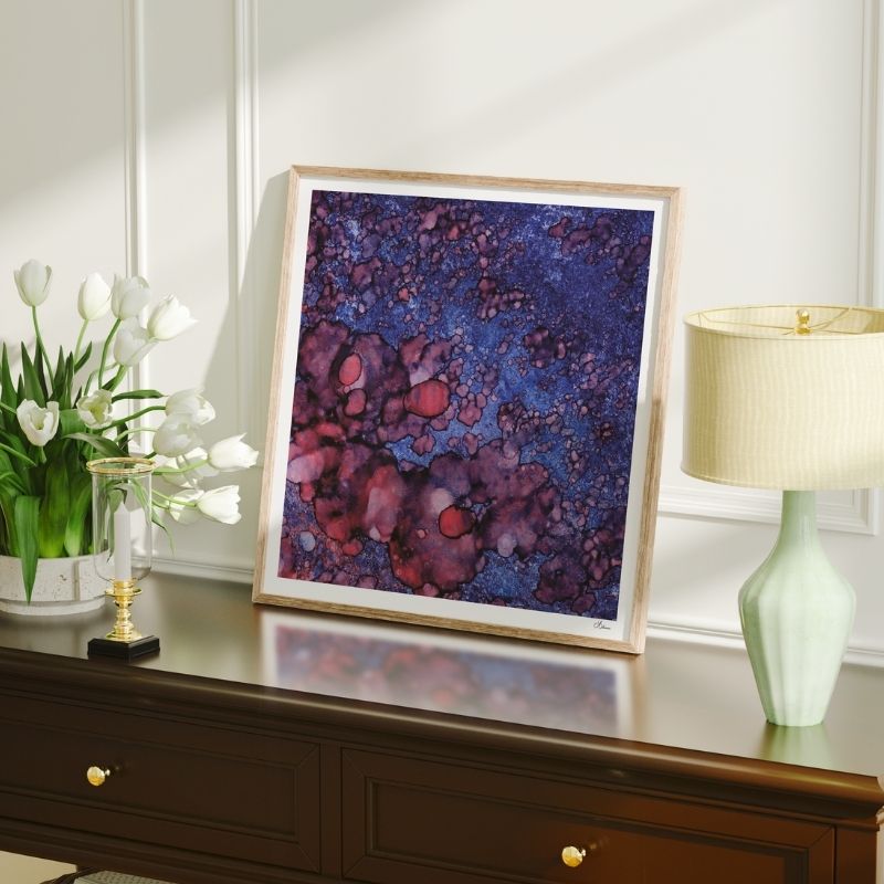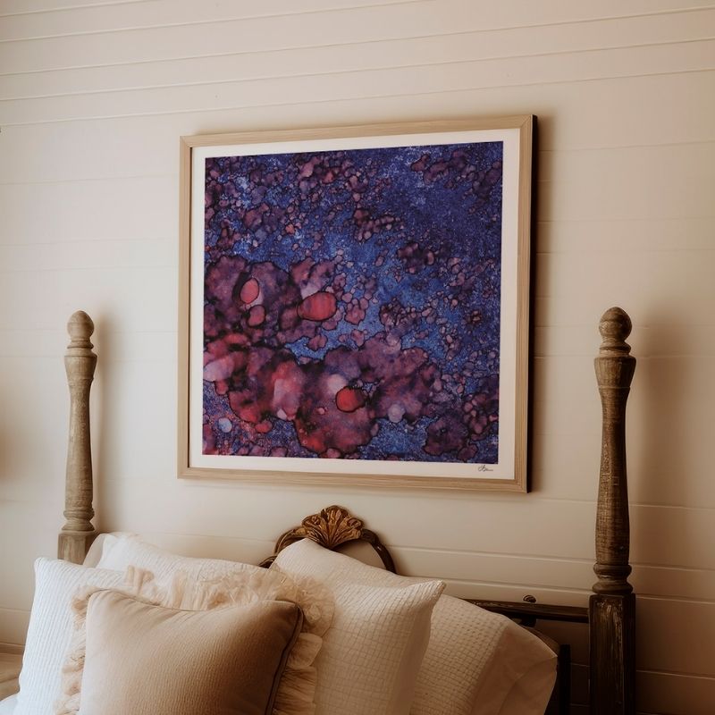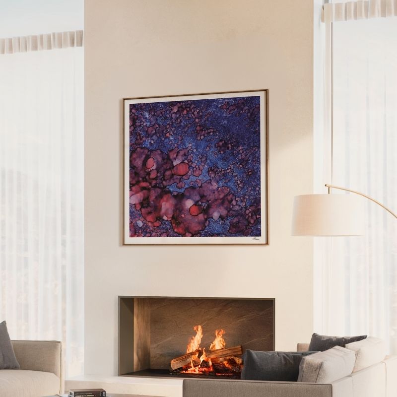 Twilight Shadow reflects the vast beauty of the night sky, layering deep blues and rich purples with subtle hints of crimson. Inspired by the boundless feeling of space, it encourages quiet reflection and serenity. Ideal for rooms seeking a sense of wonder, this piece gently brings the cosmos indoors.
